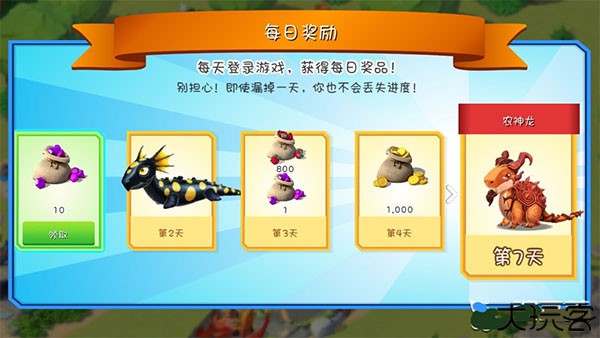 1、每日奖励:每天登陆都会有额外的奖励,登录满7天以后会得到稀有的龙。