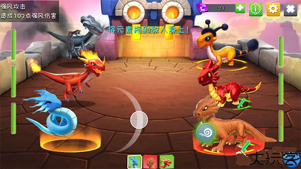 3、战斗期间,把元素滑到龙身上不要立即放开,可以查看对敌方龙伤害的红色血条,合理选择元素用在合理的龙身上,可以减少自己龙受到的伤害。