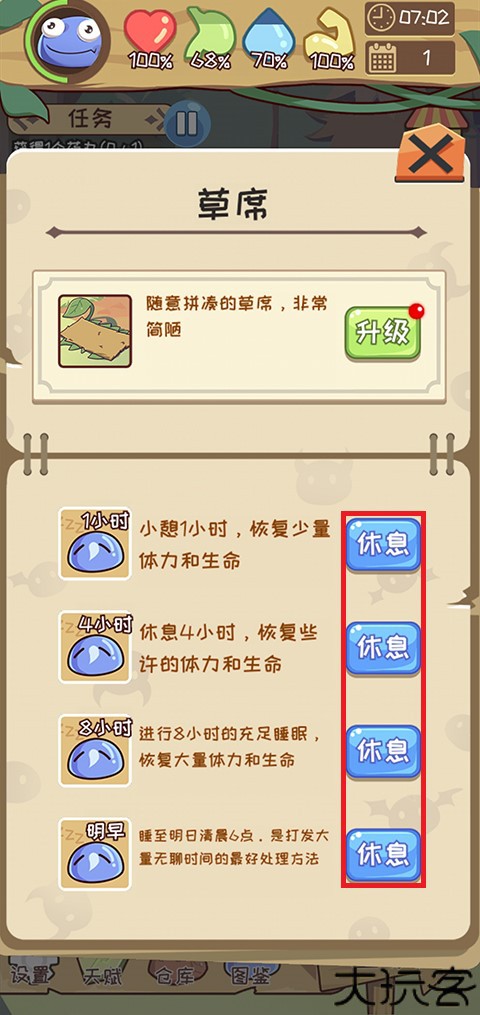 点击营区设置休息时间,恢复体力与状态准备下一天。