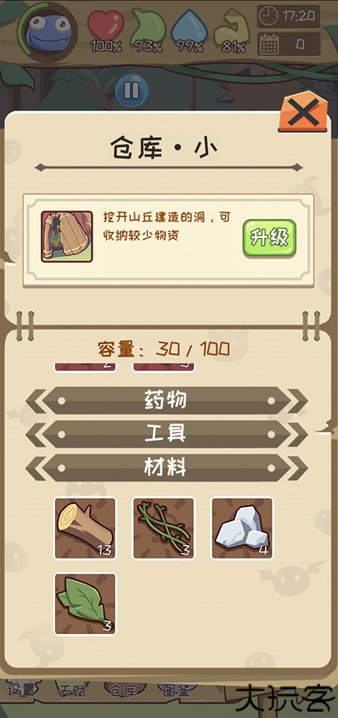 优先建造篝火,随后可解锁并合成更多实用工具。