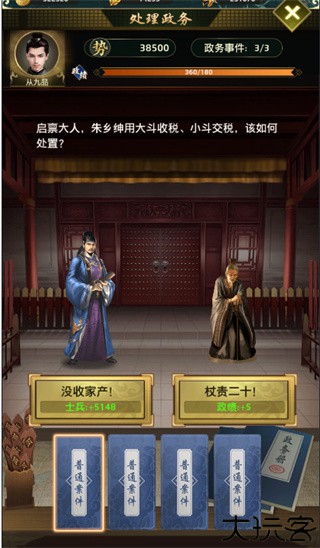 2、玩家在府中点击师爷进行政务处理,通过完成各种政策以获得相应的奖励。