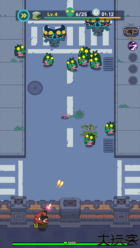 玩法类似经典的僵尸射击塔防,主角站在底部,敌人一进入射程就会自动攻击。根据手中的武器,攻击方式会有所不同。游戏内有经验值系统和经典的肉鸽三选一选项,可以增强武器或者解锁新的技能,增加了可玩性。