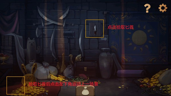 3、右场景取匕首,返回割断绳索,反复点击猫爪门开启。
