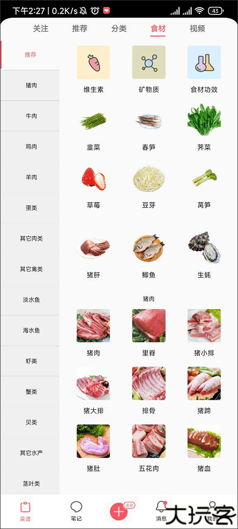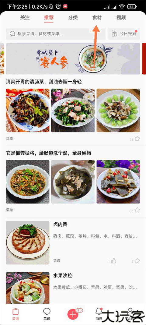 1、打开App首页后,点击顶部“食材”选项卡进入对应分类页面。