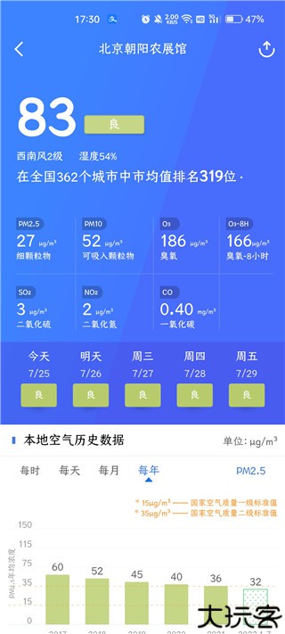 3、有着空气指标的情况显示而且附有30天/24时柱状变化表。