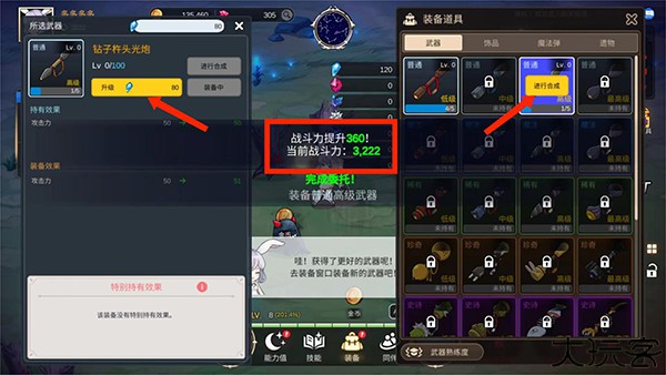 4、角色成功击杀小怪后也能获得装备,可以在武器栏中对武器进行升级和合成,会提升一定的战斗力。
