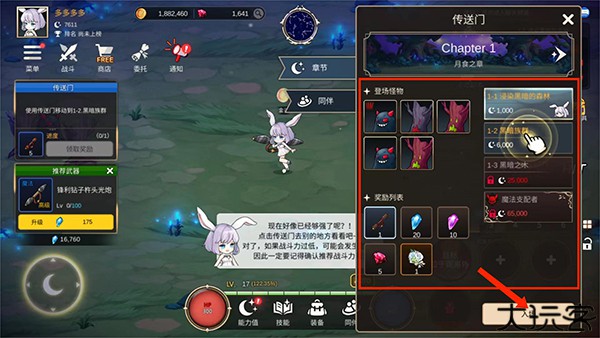 5、随着角色不断升级,游戏可以不断解锁更强的地图,选择【传送门】选项,这里有每个地图的怪物和奖励说明,选择角色符合实力的地图后点击【入场】即可开始挑战。