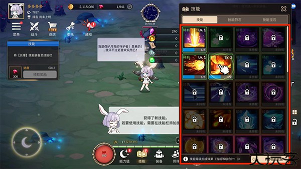 6、在战斗的过程中,角色将不断地解锁新技能,可以帮助自己更快的击杀小怪,选择需要的强力技能放置到技能栏中就可以了。