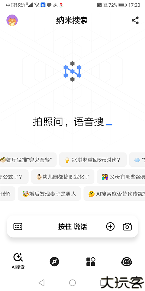 纳米AI搜索安卓版,又名为360纳米搜索,是多模态AI内容创作引擎,里面融合文字、语音、拍照、视频等多种交互方式,包含从搜索到创作的完整AI链路。,纳米AI搜索安卓版下载完成后,软件以“搜、学、写、创”为能力核心,打破传统搜索工具的边界,满足用户对于识物解题、内容创作、旅行规划等多样化的需求。软件内置AI机器人集成16大模型智慧,为用户提供强大智能支持。
