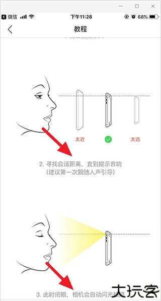 4、拍照需要注意手机前后移动,寻找合适距离,会有人声提示“太近”或“太远”,根据提示操作,合适了会有音响提示,合适了闭上眼睛,手机相机会自动闪光拍照。