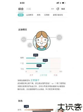 6、测完后肤质报告就出来了,可以自己了解自己的肤质了,往上滑可以看更多内容。