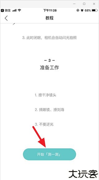 5、做好准备工作,将镜头擦干净,摘下眼镜,拨开刘海,不可以逆光拍摄,都准备好了后点击“开始测一测”,根据前面的提示操作即可。
