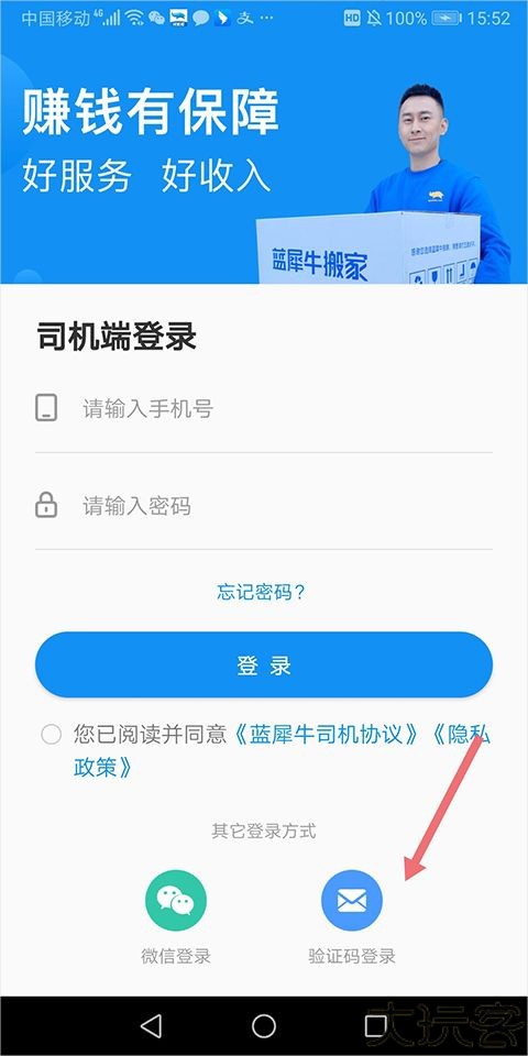打开蓝犀牛司机端App,点击页面底部的验证码登录入口。