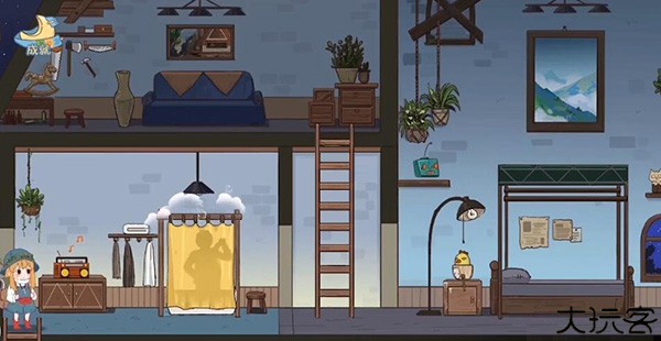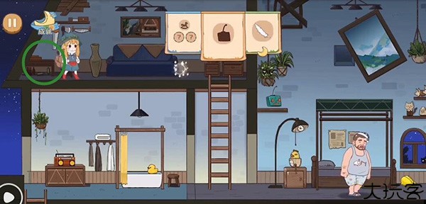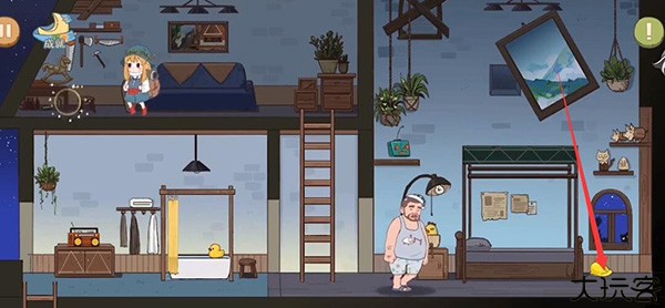 4、拿到帽子之后我们返回在床头上这边有一个闹钟,设置一下,去爬梯子。闹钟响起之后它会被惊醒,然后他床上方的这根杆子就会被打下来,之后继续入睡。下去拿到这个杆子,去拿台灯处的一样道具。左边这浴缸这边还有一个小鸭子可以收集。最后回到一开始的地方,通关。