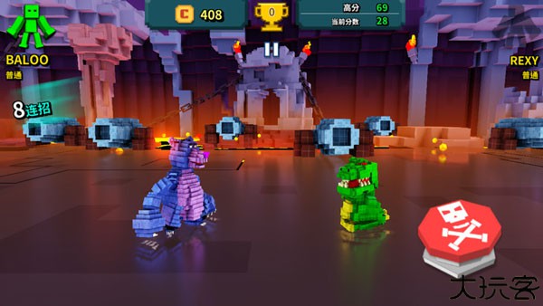 5、因为是积木人物,受伤后是以掉落躯体的方式。当玩家击打敌人至手脚全落之后,玩家可以注意屏幕的右下角会有一个骷髅按钮,点下去就可以挽救的像素超级英雄就会用帅气的一串动作终结敌人的生命!KO!