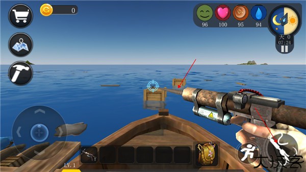 1、玩家点击并进入游戏后,玩家会出现在一条小船上,需要通过手中的标去获取物资,准星对准木箱或浮木,长按右下角的图标发射。