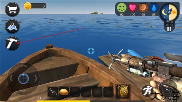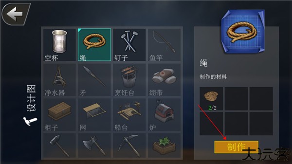 3、如果玩家想要在这个小船上生存下去,就必须要学会利用拾取物质来制造有用的物件,点击左侧的锤子图标就能进入制作页面。