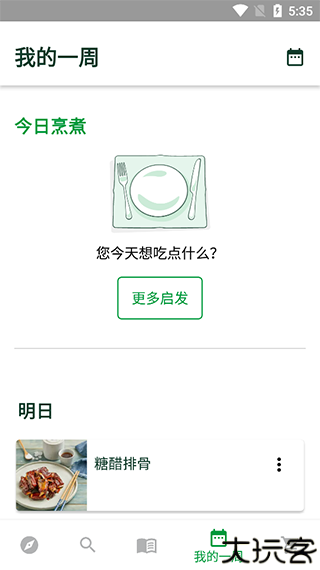 2、在【我的一周】页面里,点击【更多启发】按键,系统会自动搜索选择一周菜谱。