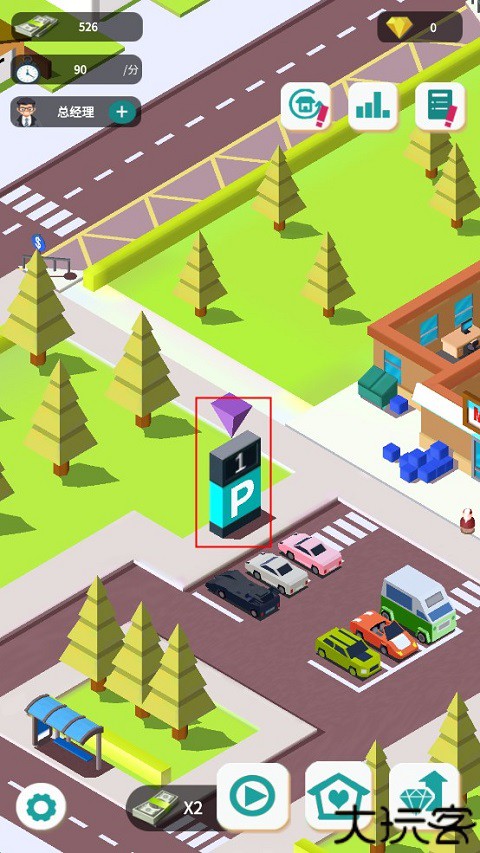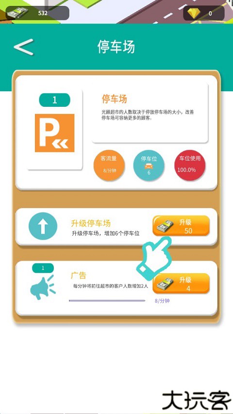 7、轻点停车标志后,在停车场的界面中进行升级,升级停车场可以增加车位,玩家还可以投入广告来吸引顾客。