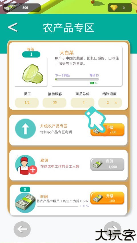 5、经营超市的目的自然是赚钱,玩家通过提升专区等级可以提高净利润。操作方法为轻点专区,在专区下方点击升级即可。