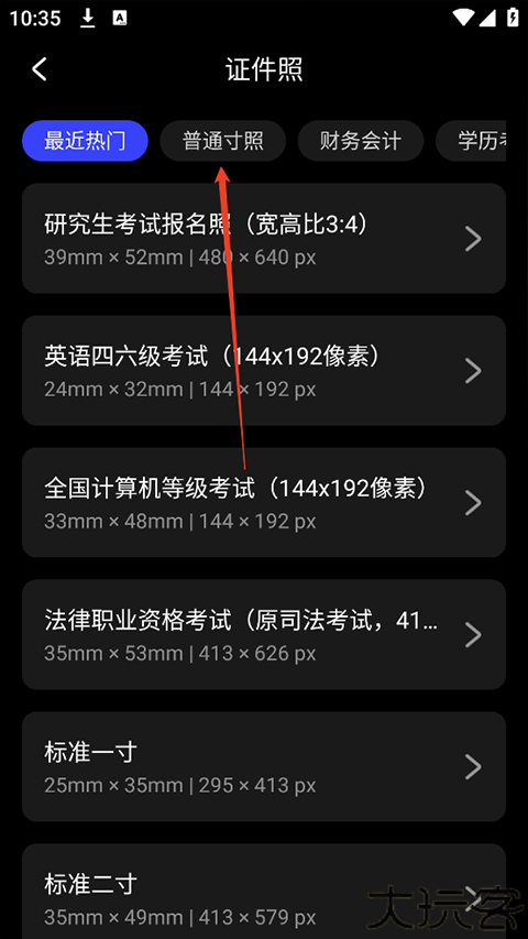 2、在打开的证件照页面下点击并选择【普通寸照】。