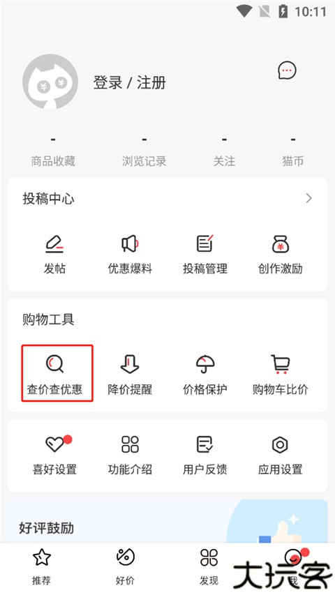 1、打开我的页面,点击“查价查优惠”功能模块。