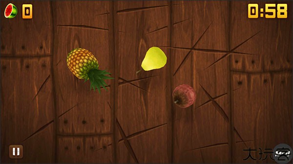 无限时间切水果,炸弹触碰即停,三次失误机会,得分满百可补失误。