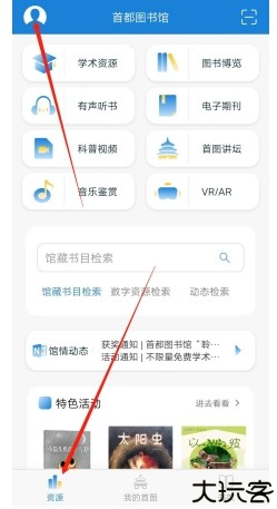 在APP首页点开“资源”栏目,右上角头像进入个人中心。