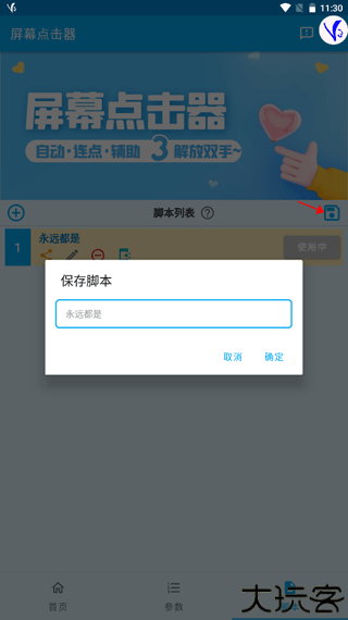 4、如果用户要保存脚本的话,在脚本列表上点击编辑按钮,在弹出的对话框中,填入想要保存的脚本名称,再点击确定即可。注意:保存脚本时,如果输入的脚本名称发生变化的话,将会以新名称另存为一个脚本,而之前脚本不变。