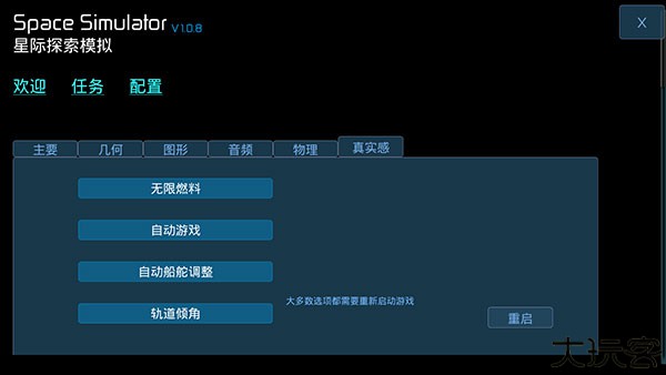 6、第一次游玩建议在菜单配置界面中开启全部的真实感选项,以熟悉游戏的各项操作。