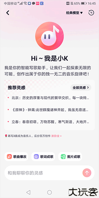 快歌ai写歌能够借助先进的人工智能算法,只需输入一句话或几个关键词,便能快速生成专属音乐,风格涵盖多种类型,满足不同创作者的表达需求。快歌ai写歌下载安装后,你还能使用音乐MV自动生成工具,支持图像与旋律的无缝融合,让每一首作品都能拥有独特的视觉呈现,找到属于自己的创作节奏。