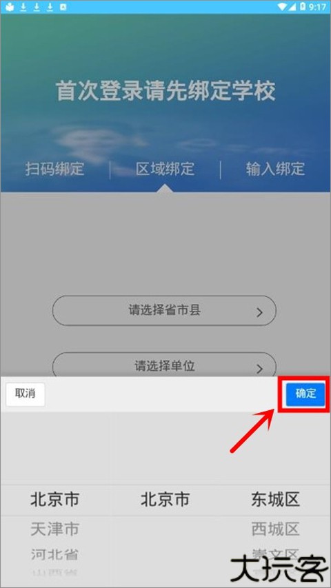 3、用户首次登录时需要先绑定学校,绑定方式为扫码、区域选择和输入绑定等几种方式。