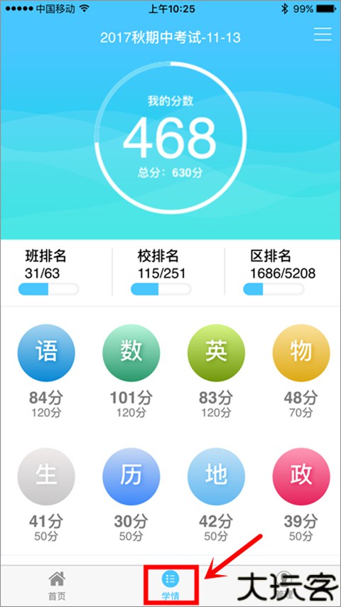 4、用户绑定学校后,成功登录进入首页,点击画面底部的“学情”,即可查看学生各科目考试成绩。