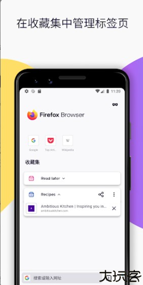1、打开火狐浏览器安卓版,用户可以自由收藏网址,在收藏集中管理标签页。