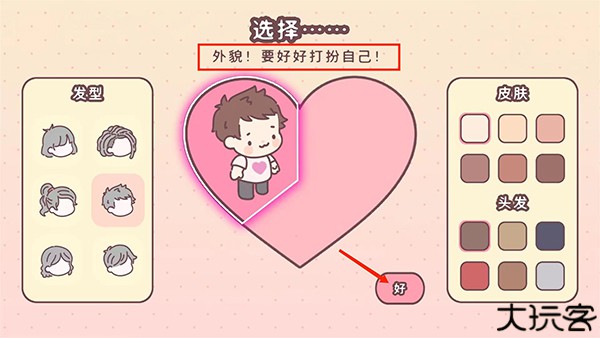 1、打开游戏后,随后进入角色diy界面,选择自己喜欢的发型、皮肤、头发后,点击【好】选项继续。