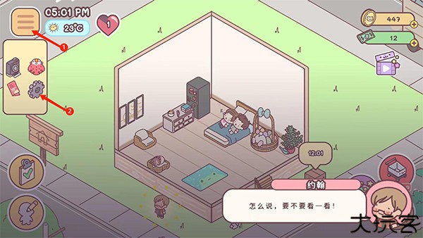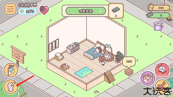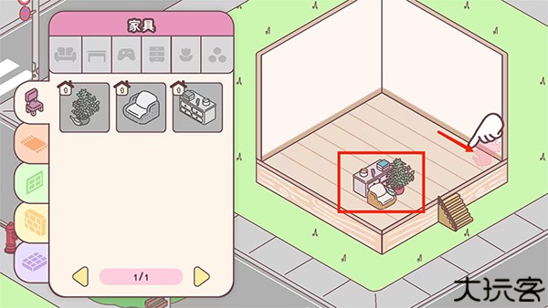 4、进入游戏主界面,玩家需要按照提示,拖动盆栽、沙发和柜子,移动到指定的位置,完成新手任务后,就是自己来布置这个有爱的小家了,