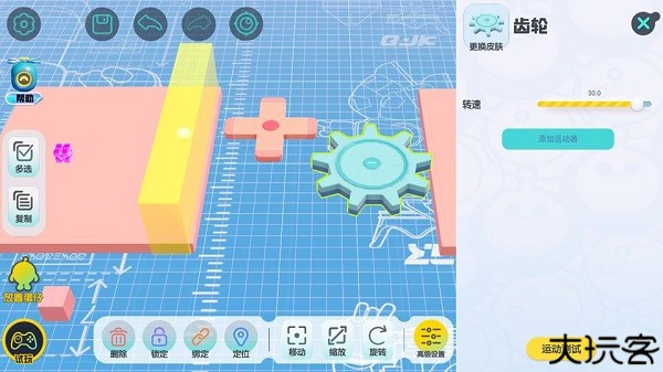 【机关组件】的详情界面中可以调整该组件的运动及其他属性参数,不同的机关会有不同的参数可以调整(比如齿轮可以调整转速)