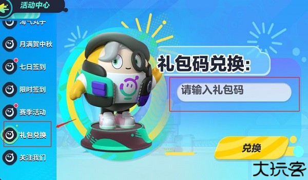 2、进入【活动中心】界面后,拖动最左边活动栏往下划到最底面,点击倒数第二的【礼包兑换】按钮后,在兑换码框内输入兑换码领取即可。