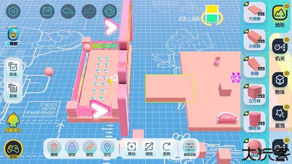 下方的操作栏,可以对选中的组件进行移动、缩放和旋转操作(默认的地形组件也同理哦),场景左边有复制按钮,以便快速复制组件