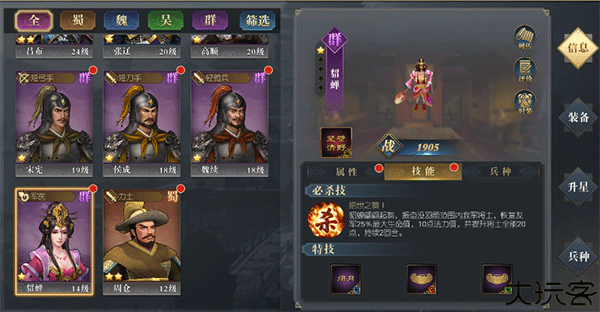 特技:每个武将都将会有三个特技,特技跟随培养而解锁升级,以下介绍皆为最高等级特技。