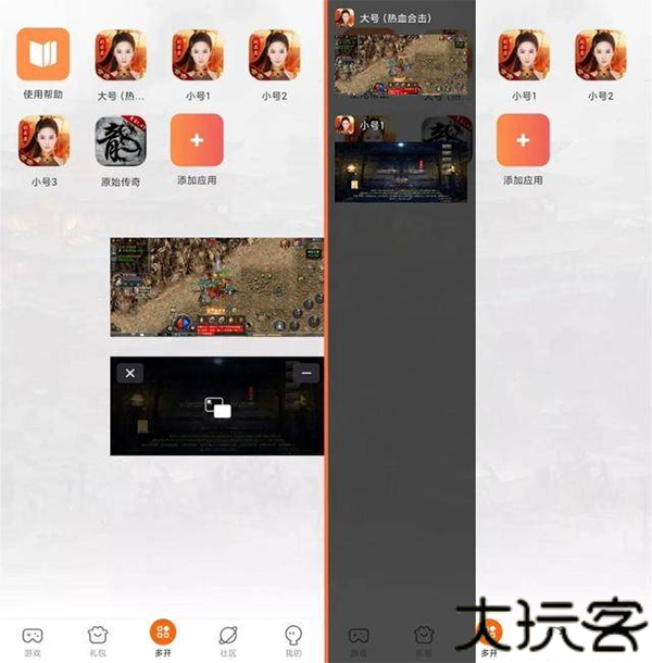 6、多开管理:需要开启其他应用的话,可以直接退回桌面,已经开启的应用就会以小浮窗的形式出现在手机上,重复添加应用、开启应用即可完成多个游戏/应用的多开。小浮窗内有最小化和全屏按钮,点击【X】即可关闭已经多开的应用,点击【-】可以最小化到侧边栏,点击中间【口】方框可以回到全屏画面。