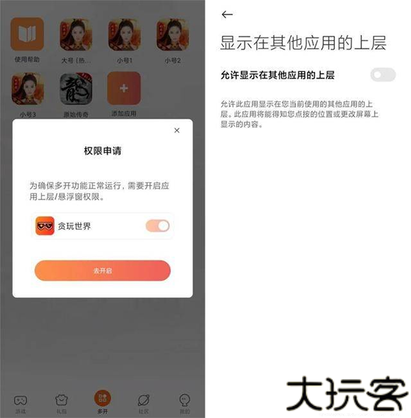 4、应用授权:勾选确定后,需要多开的游戏/应用图标就会出现在【多开】界面上,首次启动多开需要对应用进行授权,授权方式为,点击弹窗中的【去开启】,然后在应用列表上找到本软件,然后点击进入详情,把浮窗授权打开,再返回本应用内,即可完成应用授权。