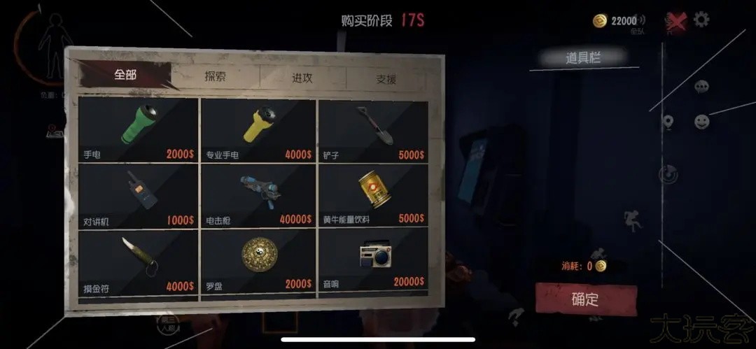 道具系统:玩家可以购买手电筒、铁铲、对讲机、电击、功能饮料等道具,准备充足,才能应对未知风险哦~