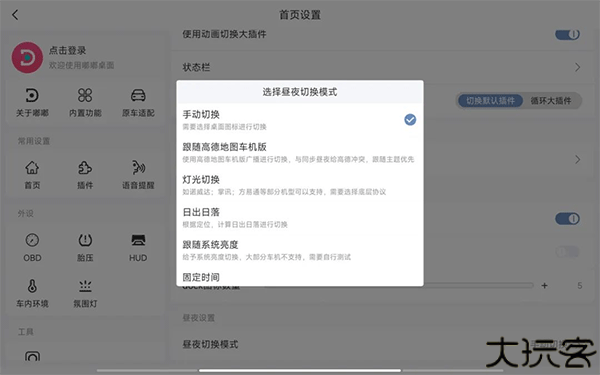白天黑夜切换模式也可以自定义,包括手动切换,跟随高德地图车机版、日出日落,固定时间,部分车型还可以根据灯光和系统亮度自动切换。