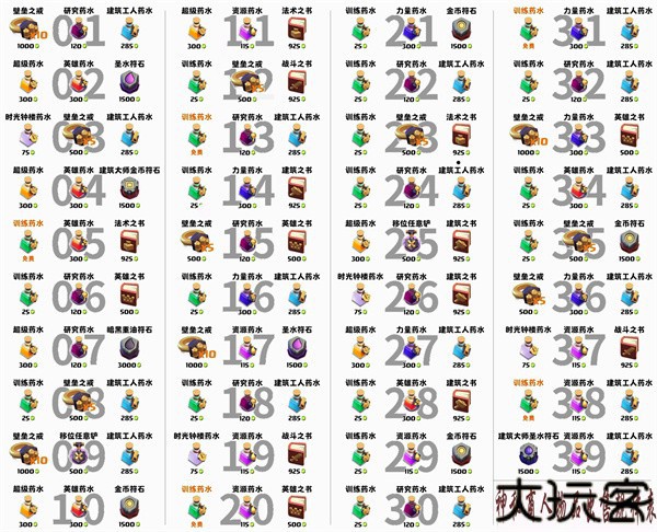 以下这张图是神秘商店每天的具体售卖的魔法物品的图表: