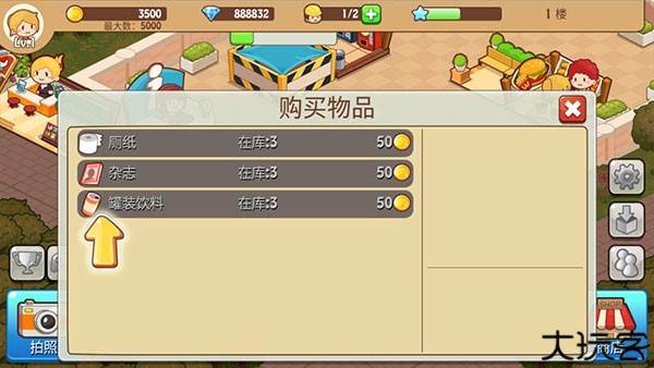 3、让我们购买一些物品,现在请选择『汉堡店』,我们将使用『罐装饮料来提高收入,如果你继续建造新的设施,你将会需要更大的空间,让我们扩大你的商店!