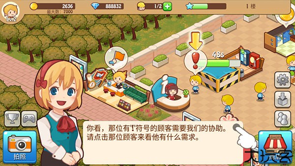 6、头顶带有“!”符号的顾客需要我们的协助,点击那位顾客来看他有什么需求,点击那位顾客所要去的设施来帮助他到达目的地。
