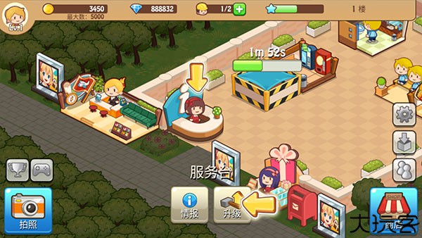 4、点击“服务台”—“升级”可扩大楼层的面积,建造更多的商铺。