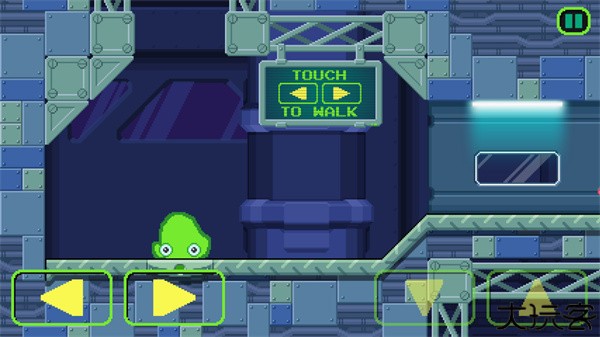 2、进入游戏之后,我们就发现主人公小粘液了,绿色的身体两个大大的眼睛,跟个三角形小汽车似得,不要小看它,它会让你目瞪口呆的,接下来我们就开始我们的小粘液冒险之旅,大家可以看到界面上方有个提示,两个左右的箭头,下边写着to move,意思就是按方向键的左右来控制小粘液的行动,如图: