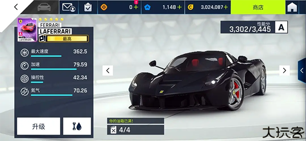 性能数据:显示车辆等级、最大速度、加速度、操控性等参数。